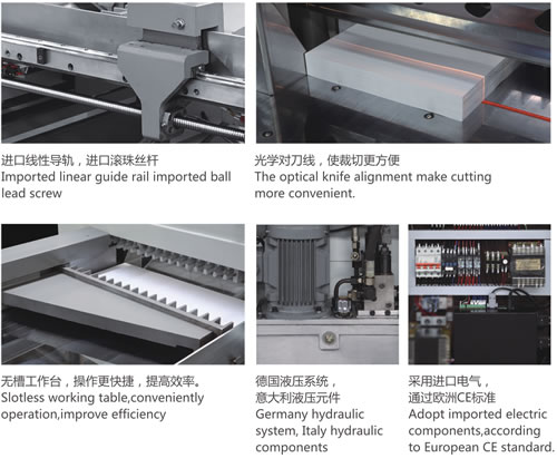 裁切刀和壓紙器均由液壓油缸傳動控制,完全的液壓傳動使機器更安全,進口的液壓無件保證了系統(tǒng)的穩(wěn)定性。